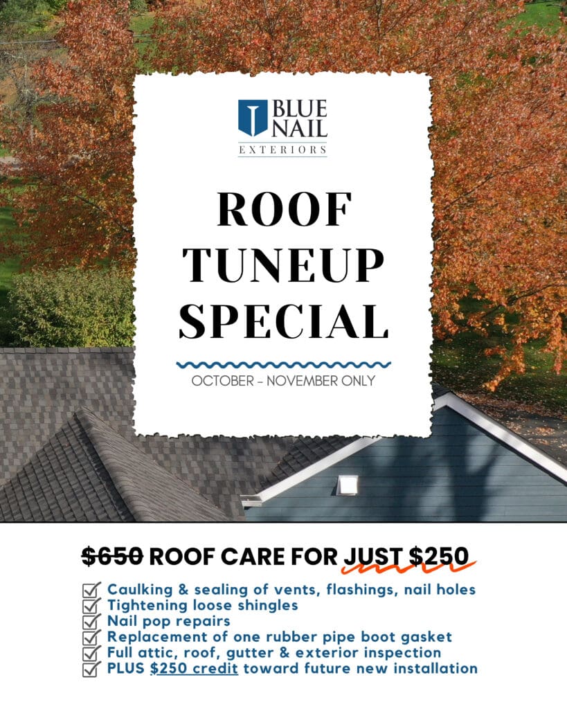 Get your roof ready for winter with Blue Nail’s Fall Roof Tune-Up Package. For only $250, our team will seal vents and flashings, tighten loose shingles, fix nail pops, replace one rubber pipe boot gasket, and provide a full inspection with photos and a detailed report.