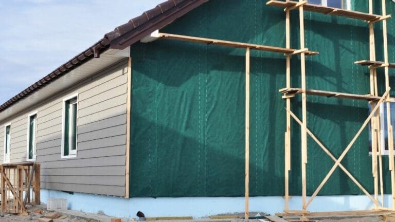 Step 5: UNDERLAYMENT – We use synthetic underlay on top of the sheathing to make a solid base for shingling. This stops water from entering the home during a storm that could blow off shingles.